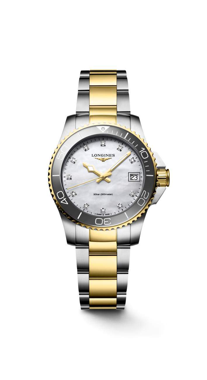 Longines HydroConquest, profesyonel dalış performansı ve günlük zarafetin mükemmel birleşimi. 30 bar (300m) su dayanıklılığı, seramik çerçeve ve tek yönlü döner bezel. L888 otomatik ve Quartz mekanizma seçenekleri. 32mm’den 43mm’e kasa boyutları, kadın ve erkek modelleri. Full seramik kasa, PVD kaplama ve pırlanta indeks seçenekleri. Yetkili bayi güvencesiyle Baz Gold’da.