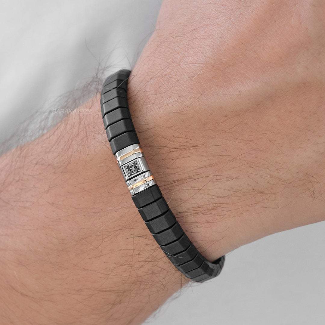 Black ceramic bracelet with rose gold, titanium, stainless steel and black diamonds. White diamond in the clasp.