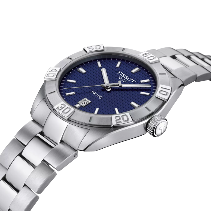 Tissot PR 100 Sport Gent, mavi kadranı ve çelik bileziğiyle şık ve sportif bir erkek saatidir. İsviçre quartz mekanizması, tarih fonksiyonu ve 100 m su geçirmezlik özelliği ile günlük kullanımda yüksek performans ve güvenilirlik sunar.